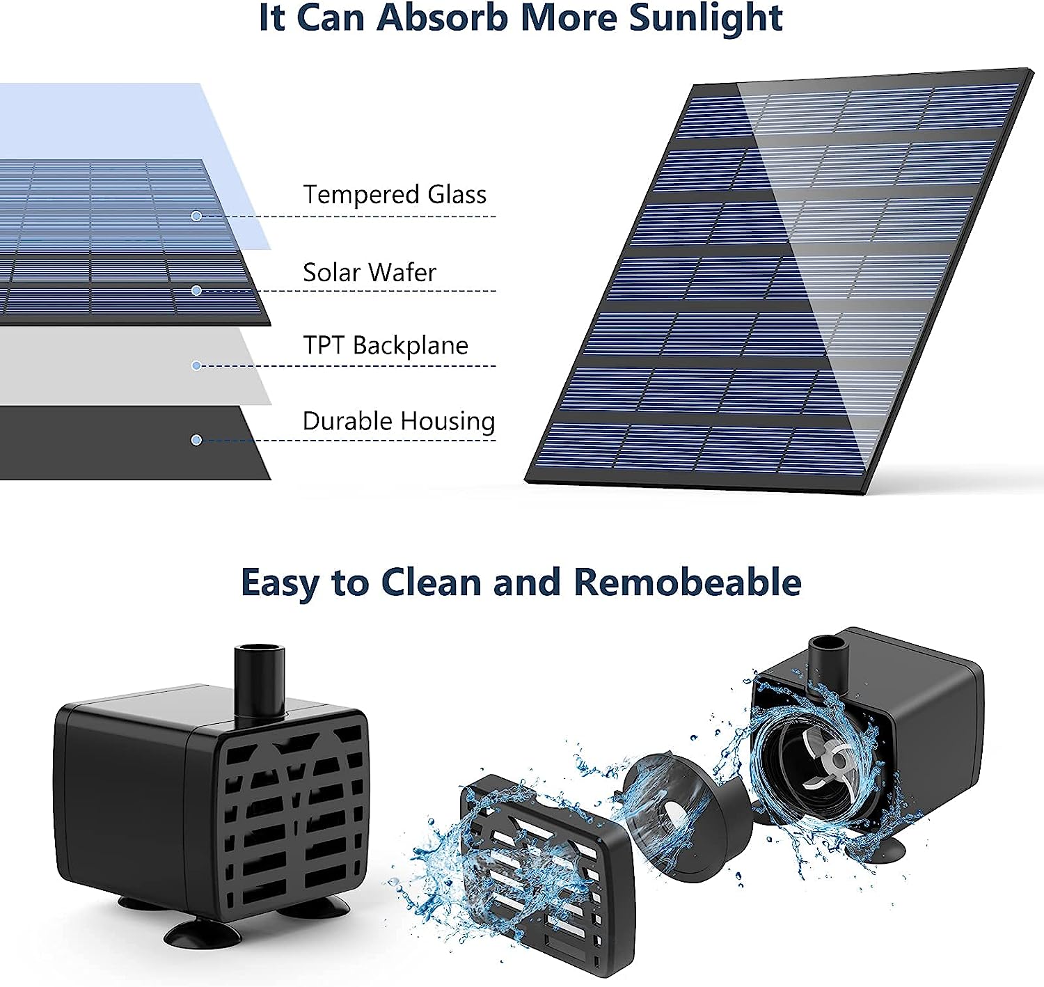 - [✔Easy to use]: You can make a fountain or a water features and then put the solar panel facing the sun, once the solar panel gets sunlight, it will start working automatically within seconds. The brighter the sunlight, the better the results. The wire between the solar panel and the pump is long enough (7.6Ft) to cover a relatively wide area without having to worry about the pump not working in the shade.